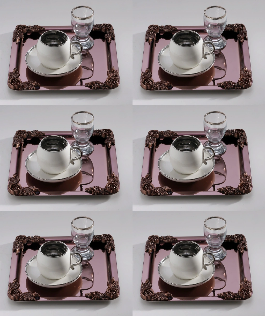 Köşe Tekli Gül Aksesuarlı Paslanmaz Çelik 6 Adet Kare Bakır Sunum Servis Tepsisi