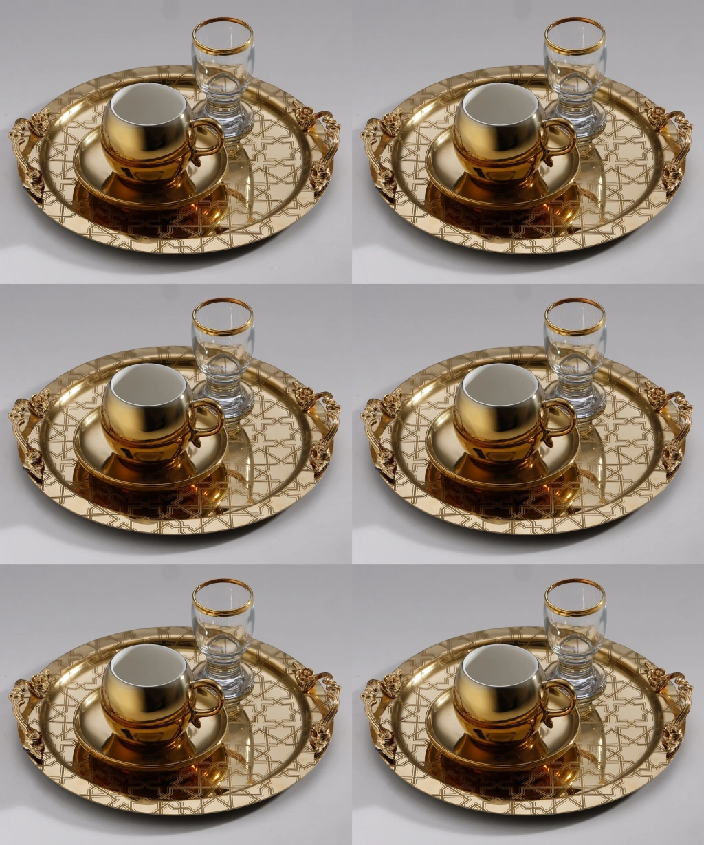 Kulp Aksesuarlı Paslanmaz Çelik 6 Adet Yuvarlak Desenli Gold AD-26 Sunum Servis Tepsisi