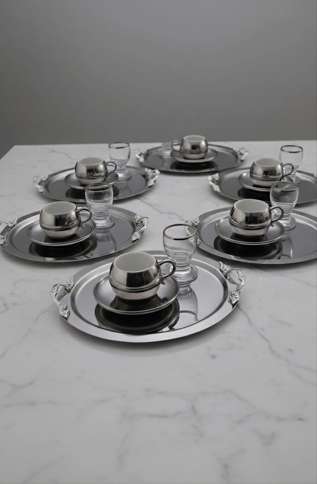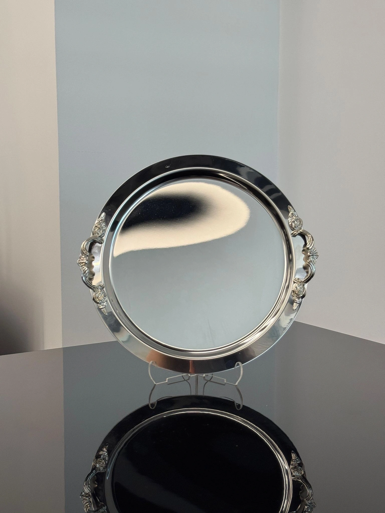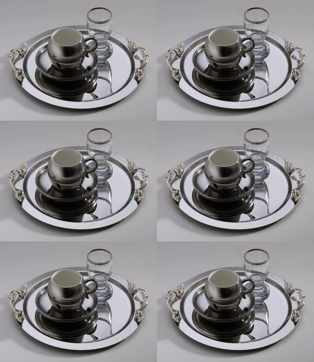 Kulp Aksesuarlı Paslanmaz Çelik 6 Adet Yuvarlak Gümüş Sunum Servis Tepsisi