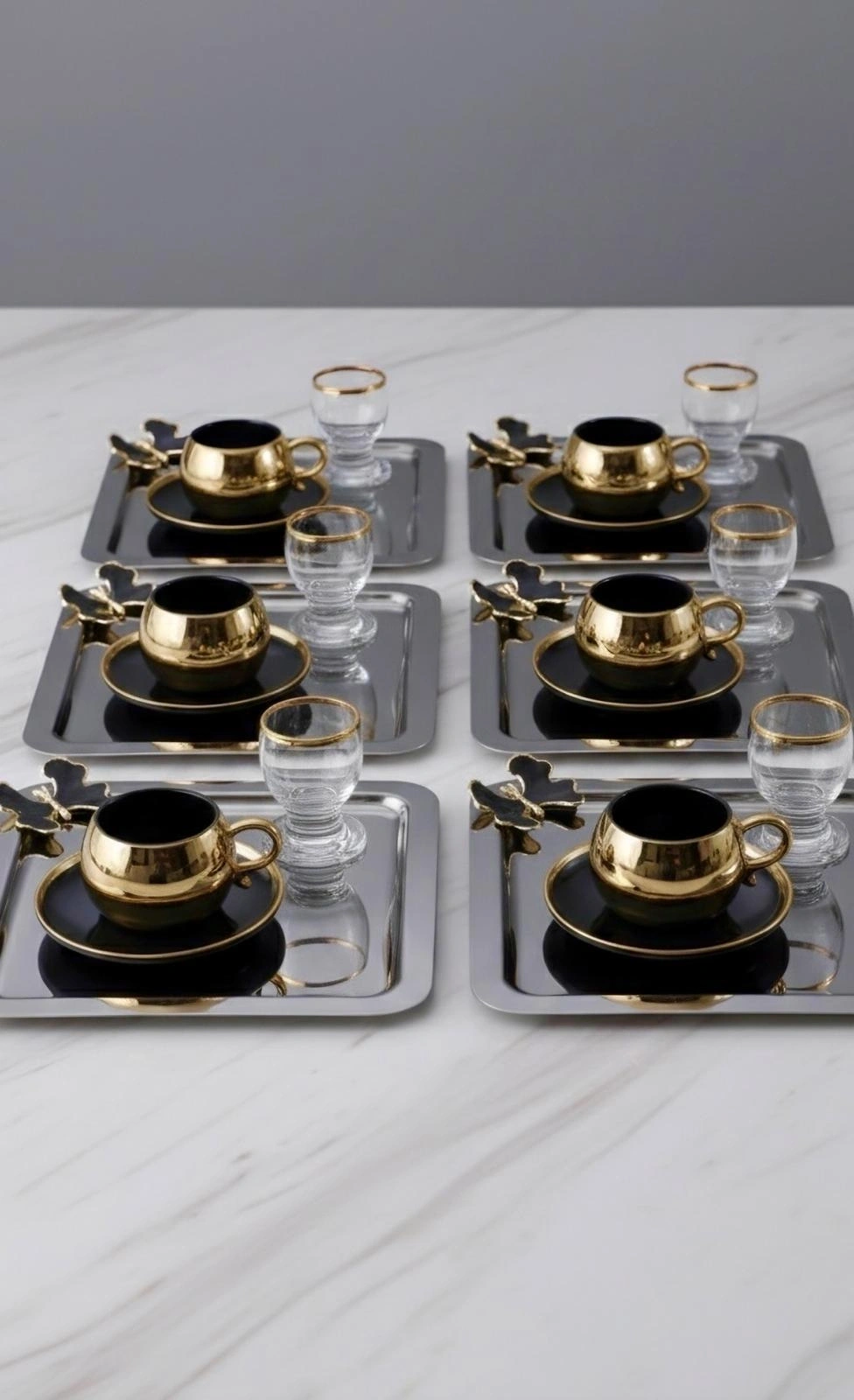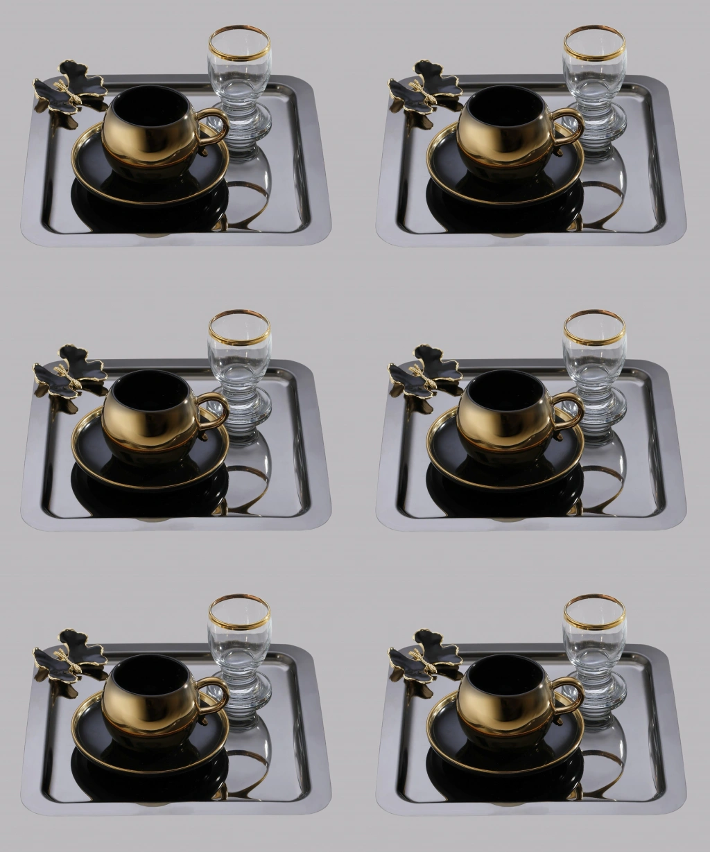 Siyah Kelebek Aksesuarlı Paslanmaz Çelik 6 Adet kare Siyah Sunum Servis Tepsisi