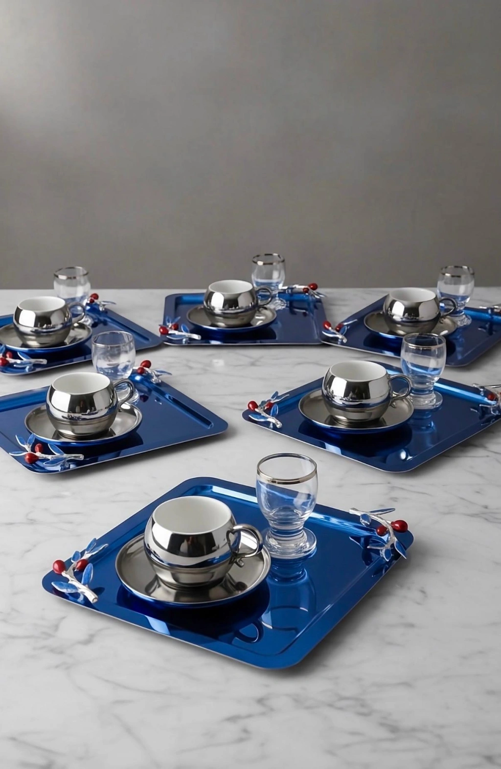 Zeytin Dalı Aksesuarlı Paslanmaz Çelik 6 Adet Kare Mavi Sunum Servis Tepsisi