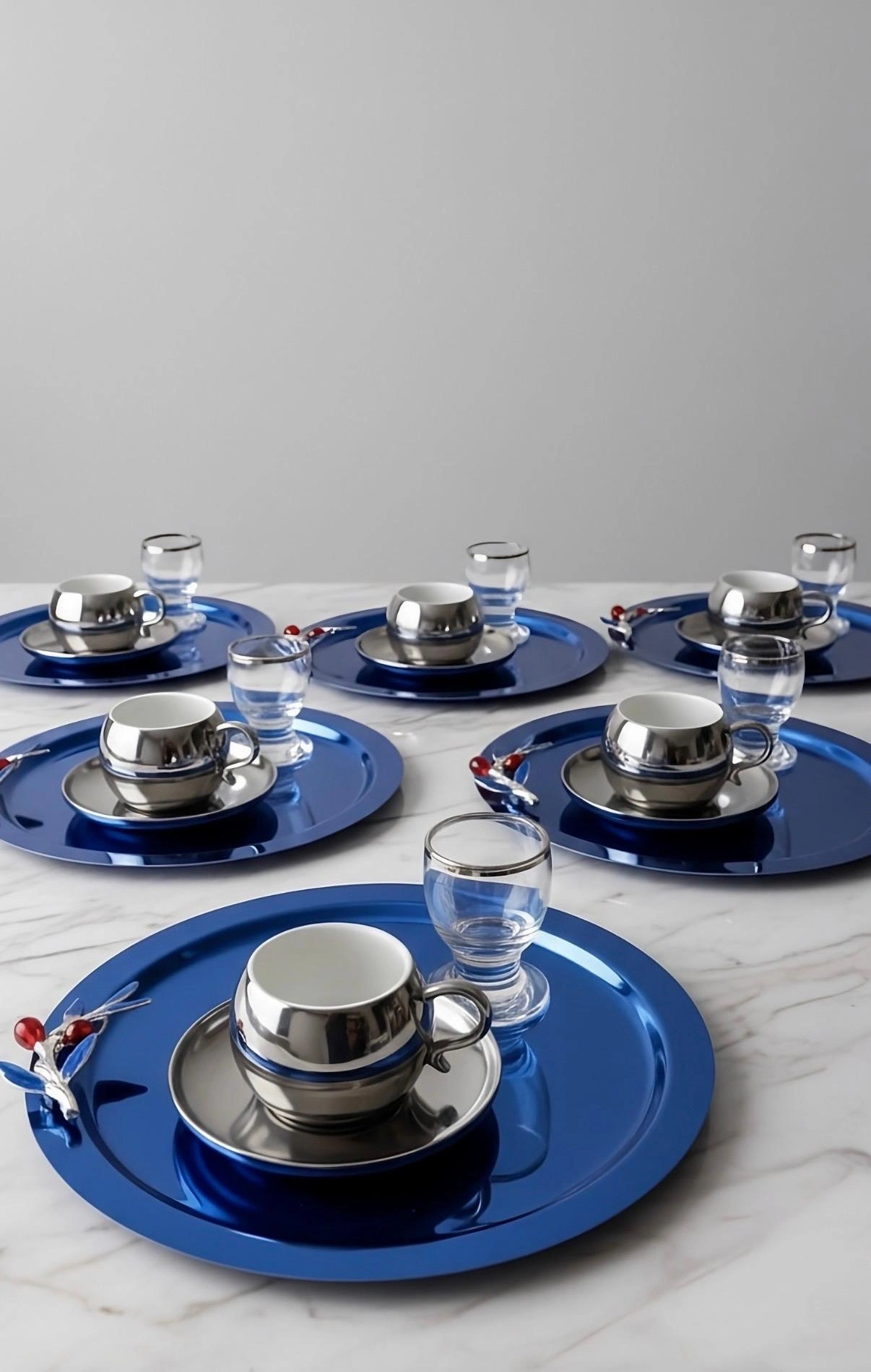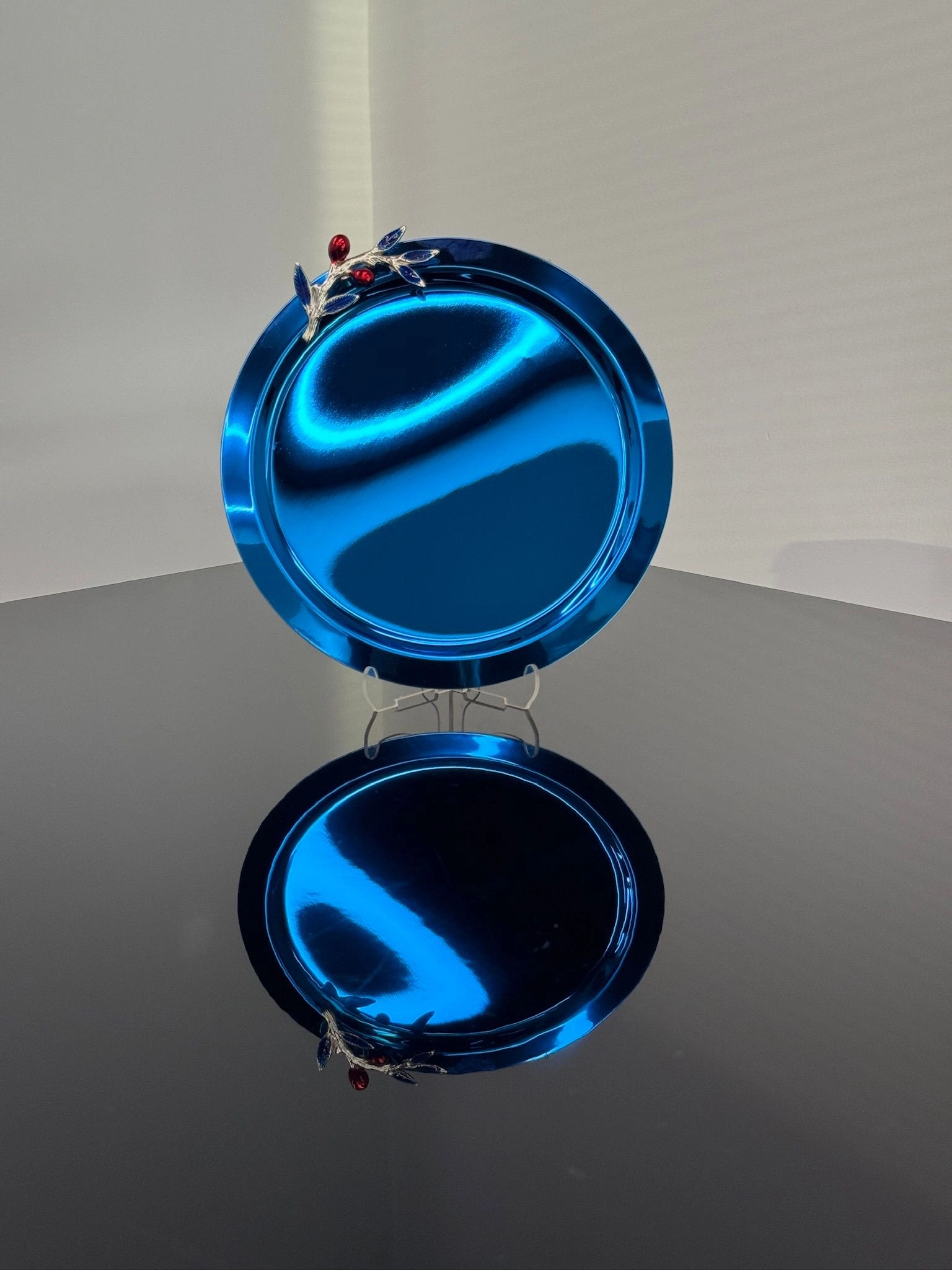 Zeytin Dalı Aksesuarlı Paslanmaz Çelik 6 Adet Yuvarlak Mavi Sunum Servis Tepsisi
