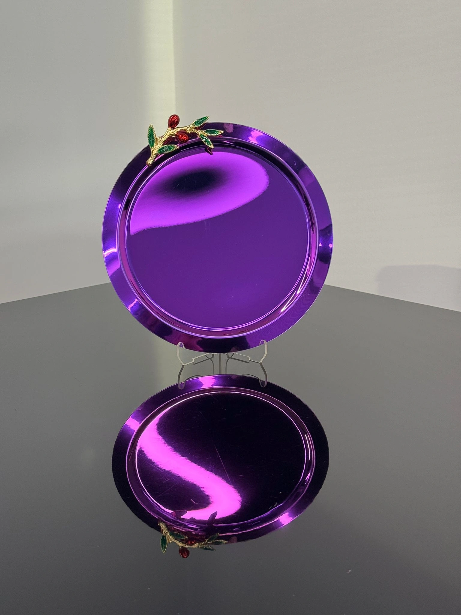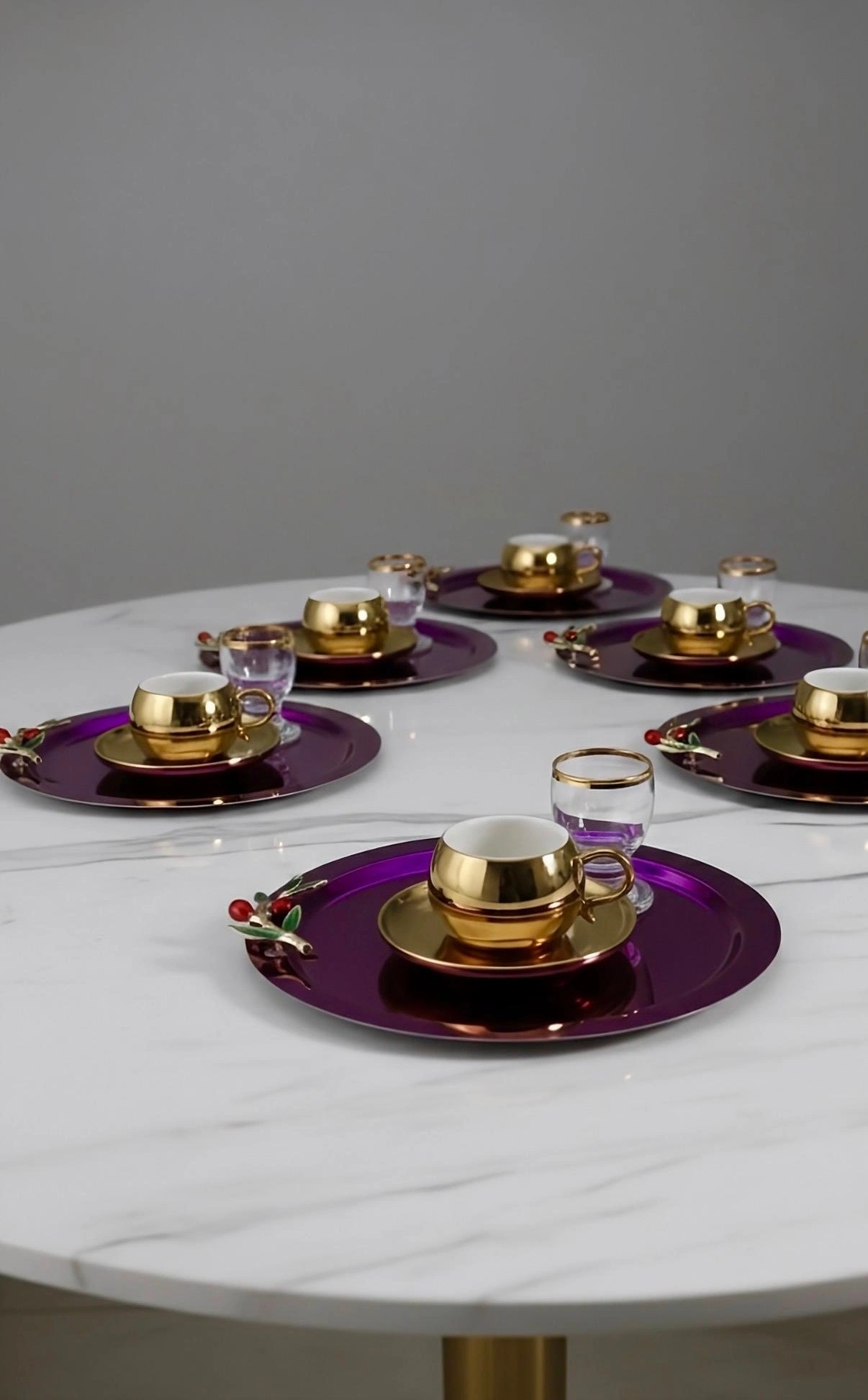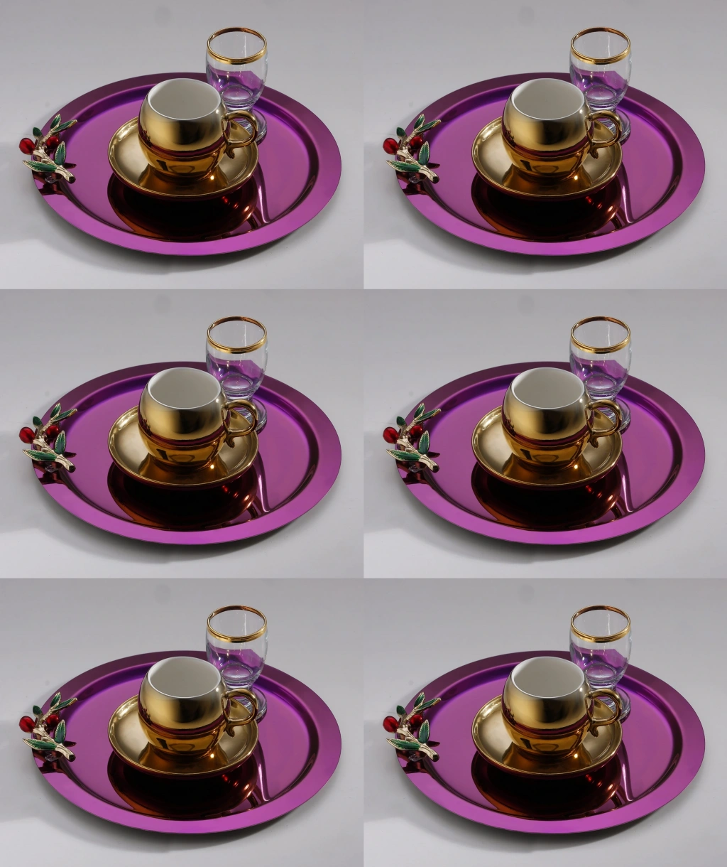 Zeytin Dalı Aksesuarlı Paslanmaz Çelik 6 Adet Yuvarlak Pembe Sunum Servis Tepsisi